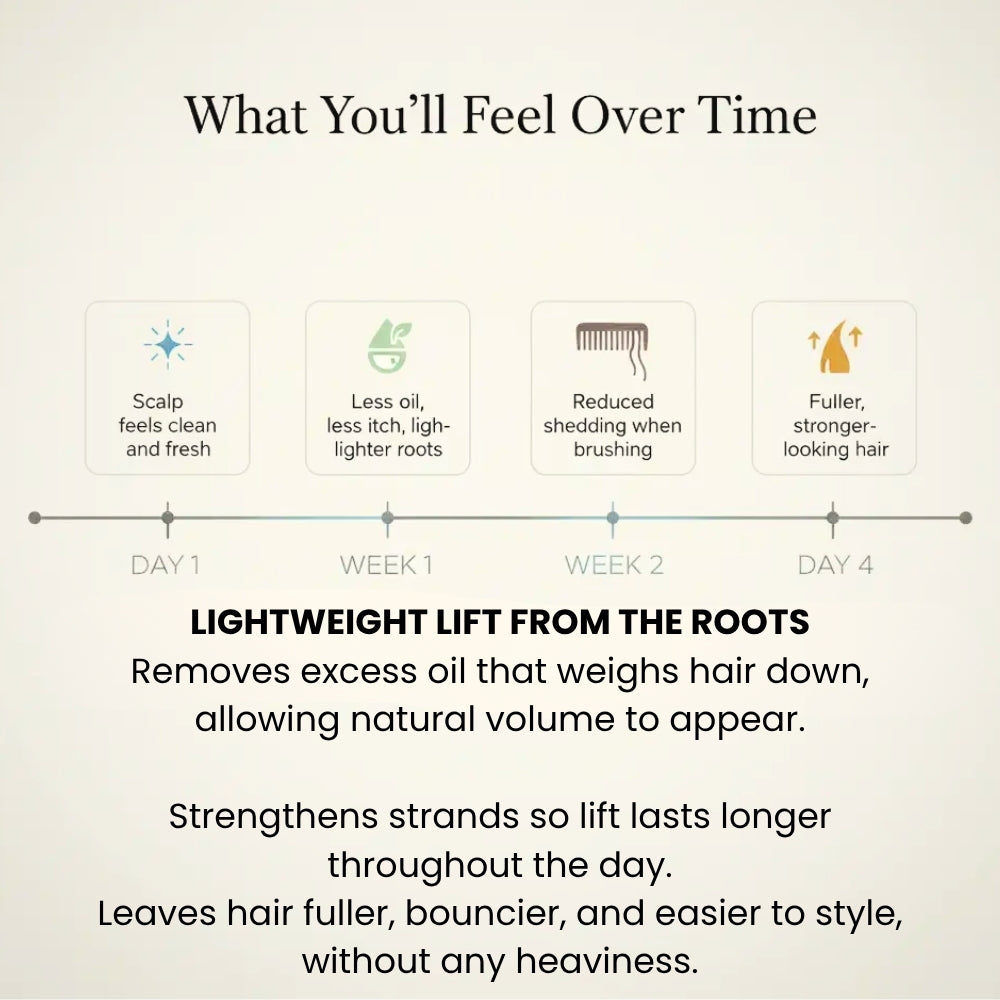 "I’ve struggled with flat, oily roots and a widening part for years. This is the first product that gave me real volume without stripping my scalp. My hair looks noticeably fuller and healthier, and the itchy, flaky scalp I used to have is completely gone."